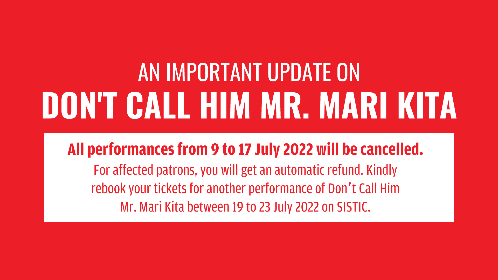For affected patrons, you will get an automatic refund. Kindly rebook your tickets for another performance of Don’t Call Him Mr. Mari Kita between 19 to 23 July 2022 here.