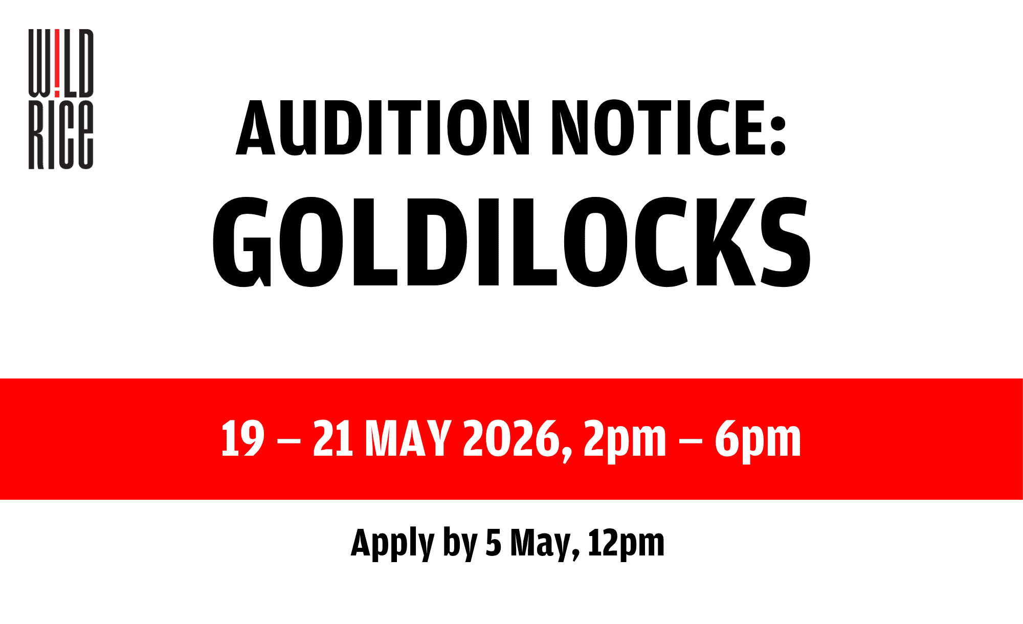 Candidates will then be shortlisted for in-person auditions. If you have been shortlisted for an in-person audition, Wild Rice will contact you by 12 May 2026 (Tuesday).
